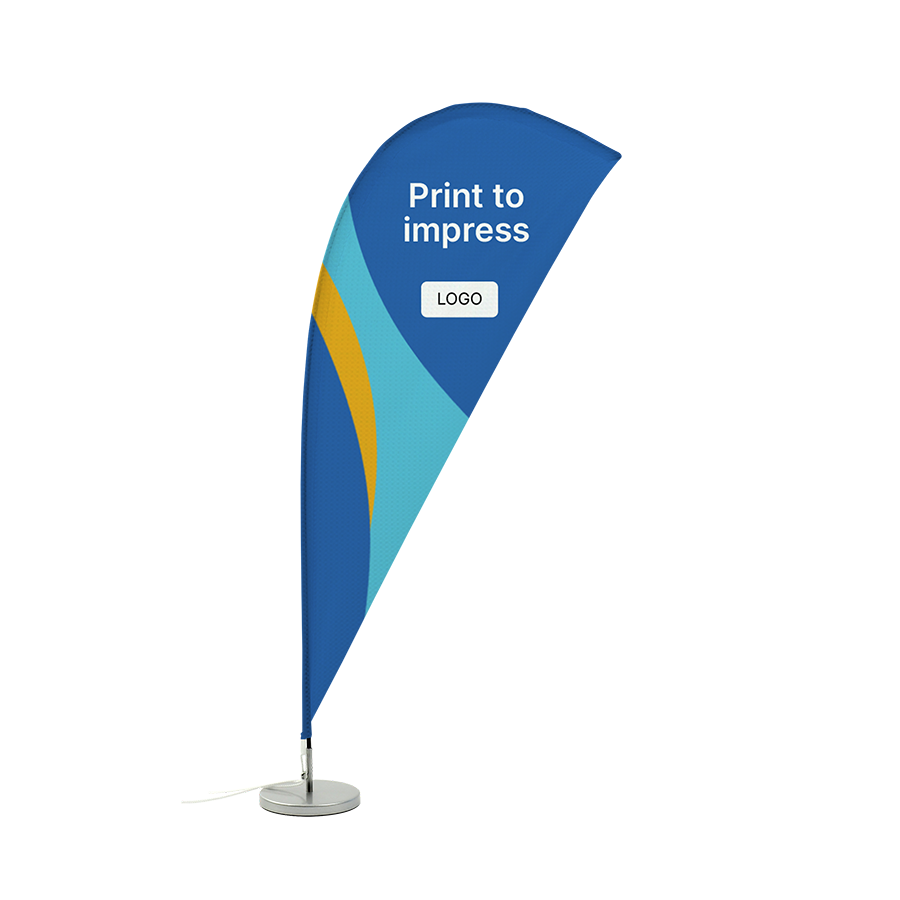 Met een doekformaat van 34 x 60 cm en een totale hoogte van 62 cm is deze mini beachflag ideaal voor plaatsing op bureaus, tafels of toonbanken. Het model is gebaseerd op de speelse Dropflag vorm (druppelvorm).