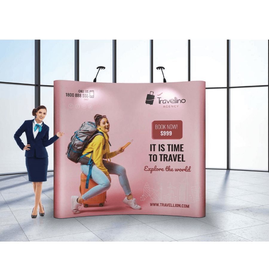 Onze gebogen pop-up wand is vervaardigd uit hoogwaardig flexibel PVC, een materiaal dat uitblinkt in zowel flexibiliteit als duurzaamheid. Het materiaal is ook gemakkelijk te onderhouden en schoon te maken, waardoor het ideaal is voor hergebruik en langdurig gebruik.