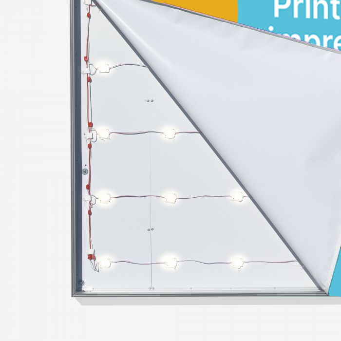 Doek – Met een krachtige 200% full color print op waterafstotend Backlitdoek bent u verzekerd van levendige kleuren, zelfs bij verlichte toepassingen. De Dibond® achterplaat met gemonteerde LED-strips zorgt voor een gelijkmatige lichtverspreiding, waardoor uw boodschap effectief en opvallend wordt gepresenteerd.